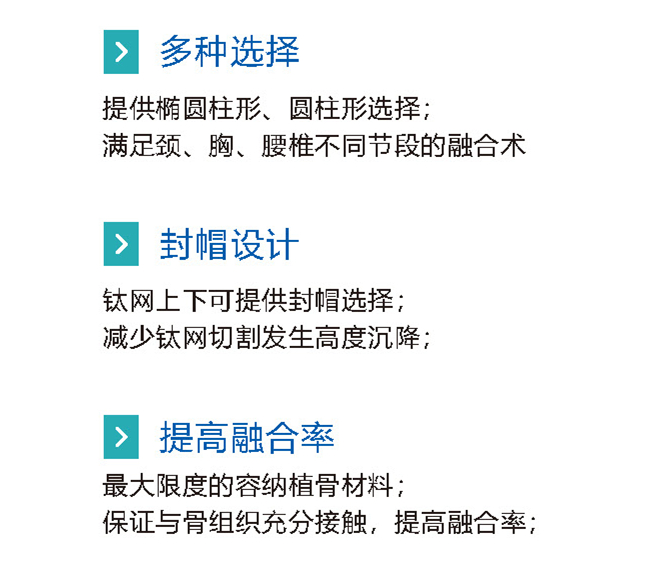 椎體融合器由鈦網、端蓋、端蓋螺釘組成。椎體融合器的鈦網部分可單獨使用也可選擇與端蓋配合使用。與脊柱內固定系統聯用,用于椎體切除手術中頸椎、胸椎和腰椎的椎體替代。注冊證號:國械注準20223130697