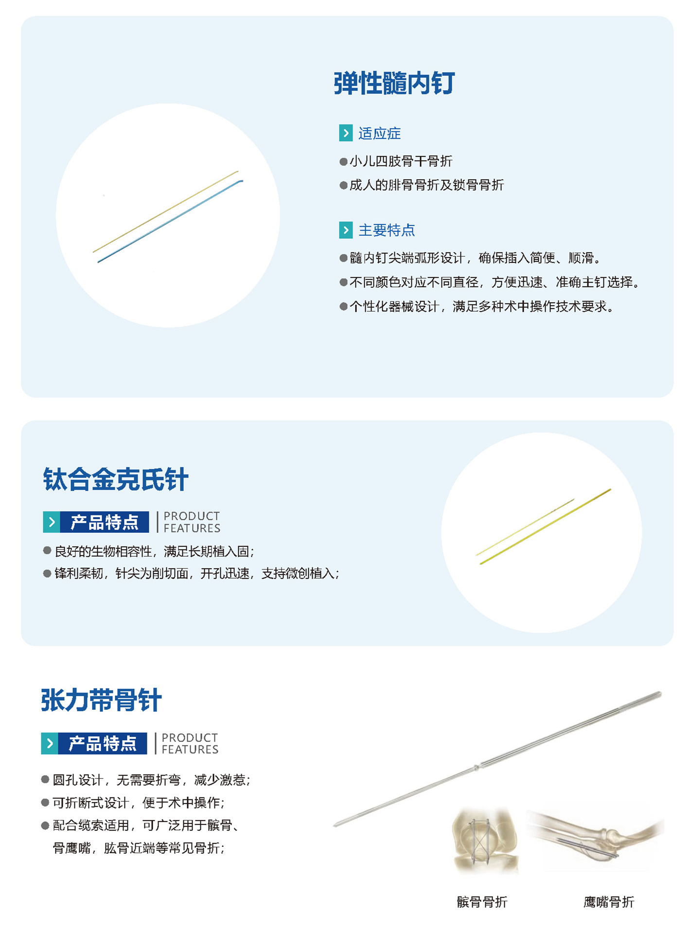 金屬骨針該產品采用符合GB/T13810標準規定的TC4鈦合金材料制成。適用于四肢骨折復位時部分植入人體做牽引或四肢骨折內固定。注冊證號:國械注準20203130290