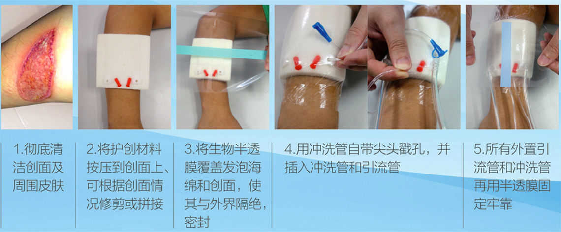 3、 采用醫用生物半透薄膜覆蓋發泡海綿和創積,使其與外界隔離、封閉;