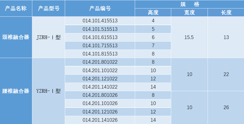 適用于與脊柱內(nèi)固定產(chǎn)品配合使用,治療脊柱椎間盤突出或退變、椎間隙變窄、腰椎假關(guān)節(jié)、復(fù)位不理想的蛻變性脊柱滑脫或峽部裂滑脫,用于頸椎、腰椎、腰骶段融合固定。