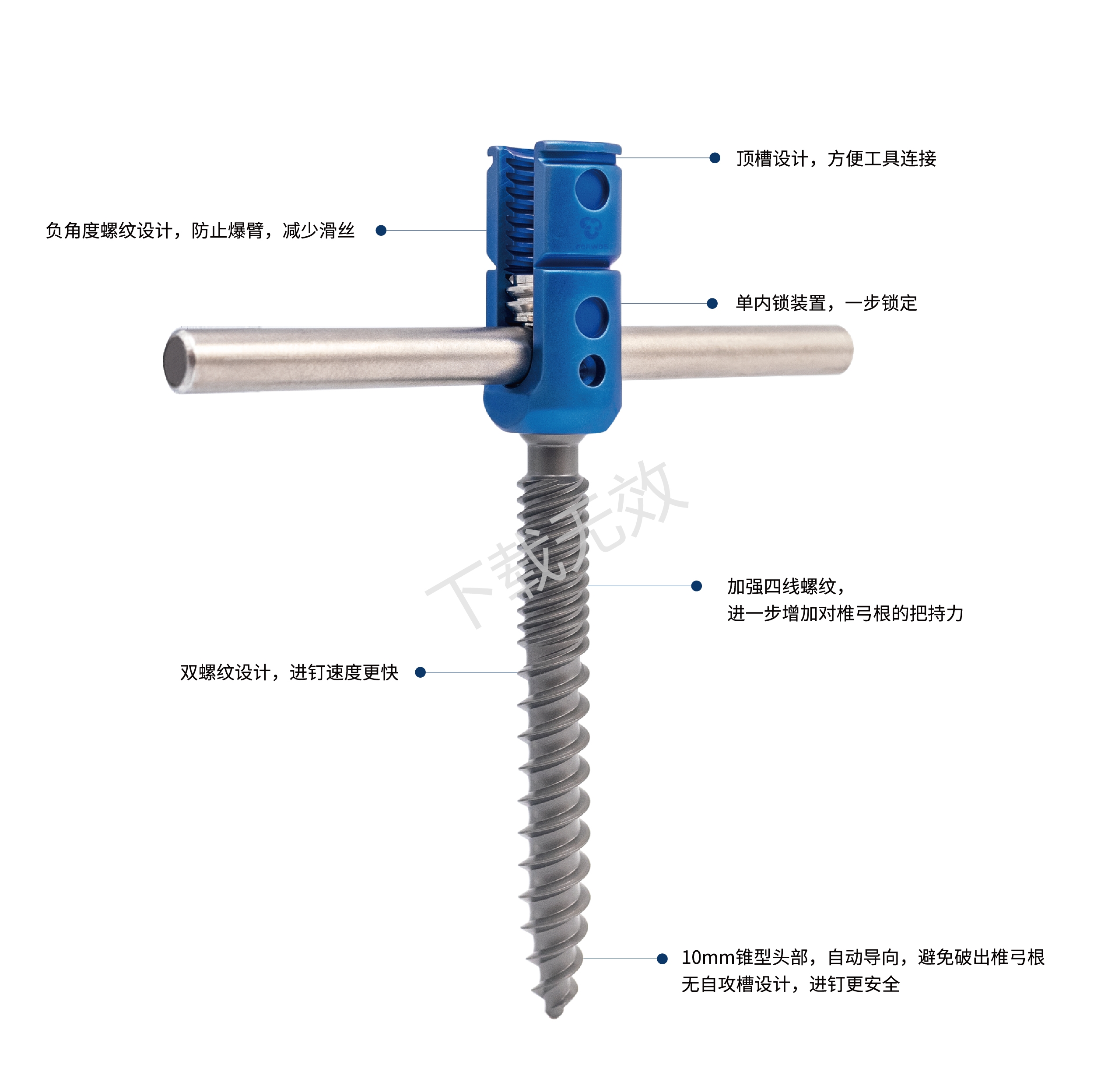 4、10mm錐型頭部,自動(dòng)導(dǎo)向,避免破出椎弓根;