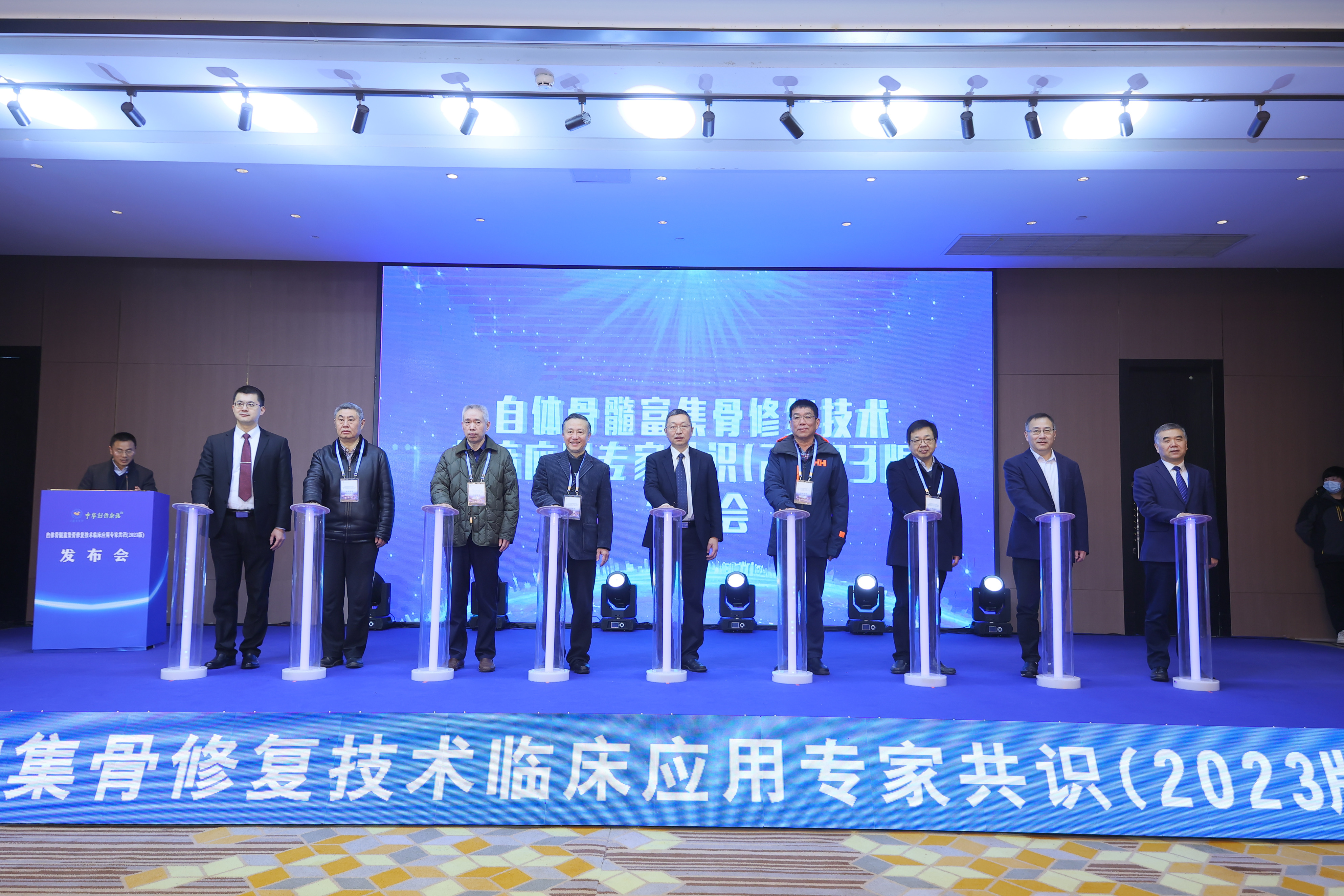 在劉國(guó)棟教授的主持下,許建中、周躍、張連陽(yáng)、葉招明、黃偉、侯志勇、范順武、徐永清、羅飛等知名教授陸續(xù)上臺(tái)站按下了啟動(dòng)鍵,自體骨髓富集骨修復(fù)技術(shù)臨床應(yīng)用專家共識(shí)(2023版)正式發(fā)布。